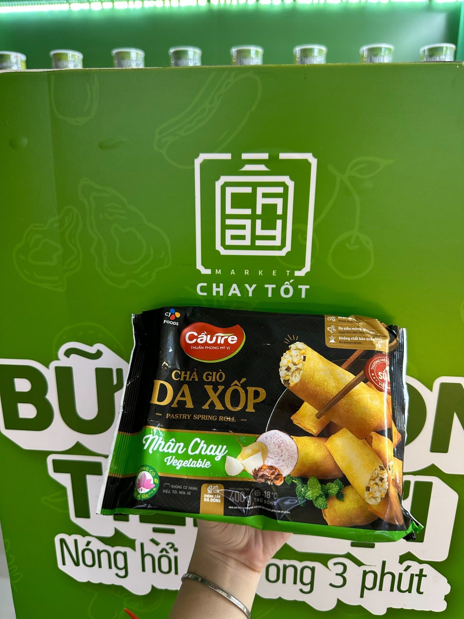 Chả giò da xốp nhân chay - Cầu Tre được xem là đồ chay đông lạnh an toàn, giá gốc 48,000đ. Thành phần: bột mì, bột gạo, nhân gồm rau củ và các loại đậu,...Cất vào tủ mát, dùng sẽ ngon hơn.