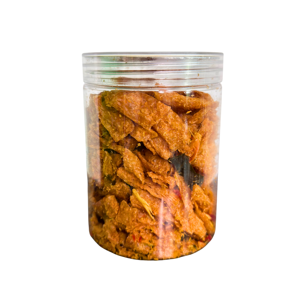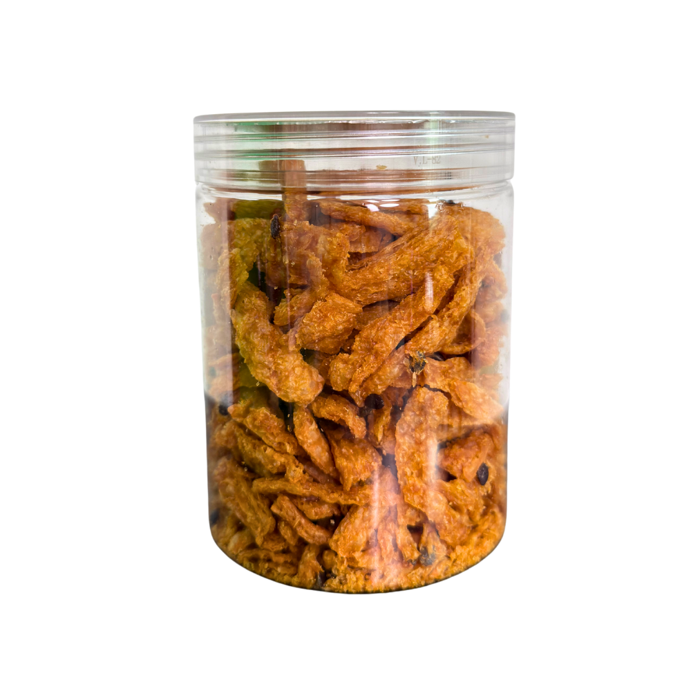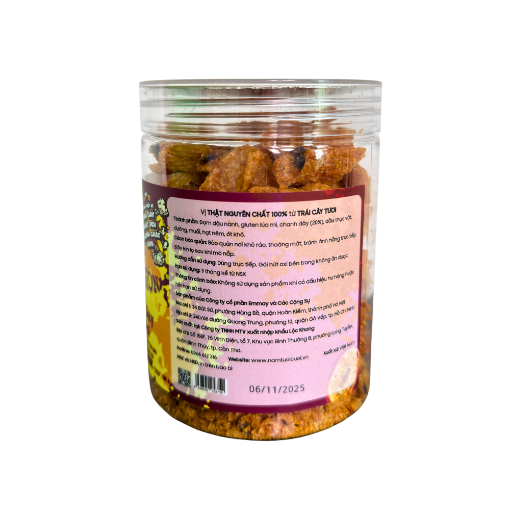 Món ăn vặt chay giòn tan với hương vị chanh dây nhiệt đới thơm ngon. Thành phần gồm đạm đậu nành, gluten lúa mì, chanh dây (20%), dầu thực vật, đường, muối, hạt nêm và ớt khô, thích hợp thưởng thức trực tiếp hoặc kết hợp với các món ăn khác.